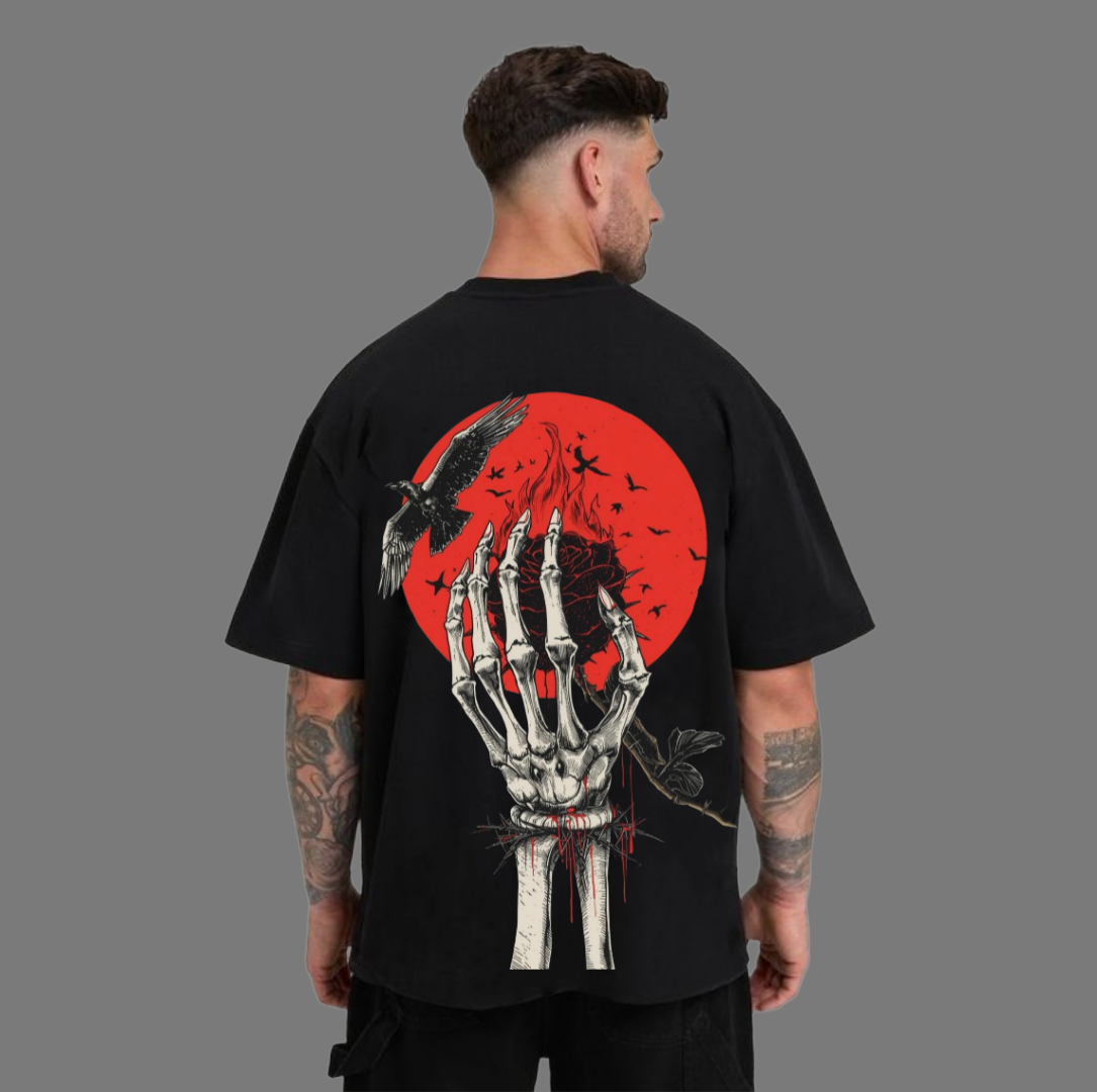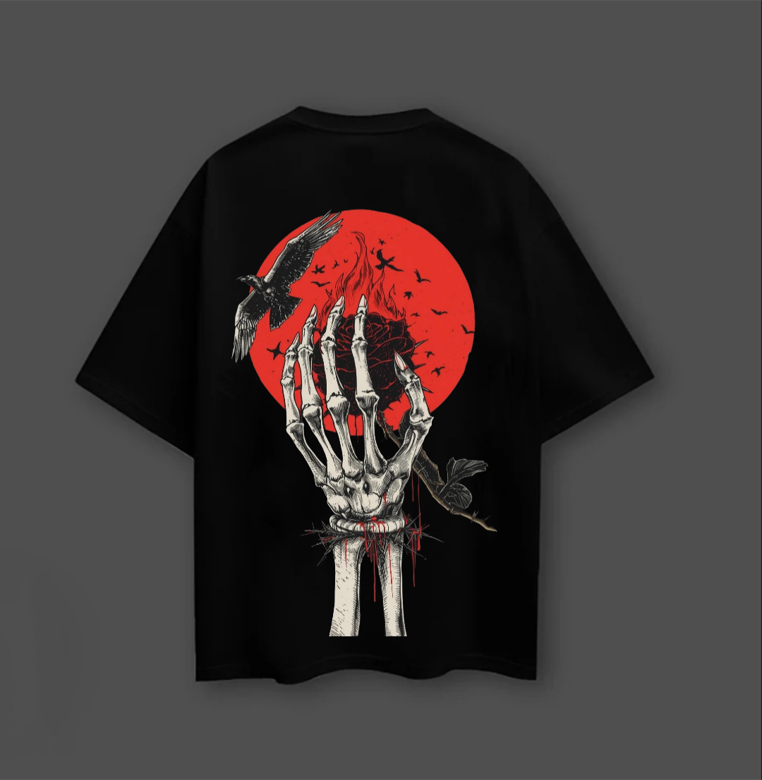When the moon bleeds red, the dead reach for the sky. A reminder that even in darkness, beauty can cut deep. Every bone etched, every petal falling, carrying the message loud and clear: life and death are bound in art.