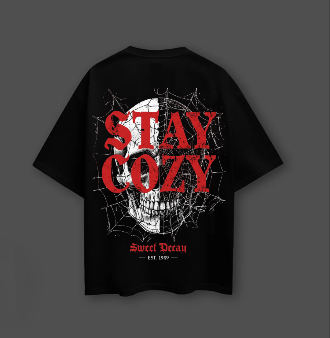 Get cozy with a twist in the Stay Cozy Tee. This tee features a striking skull design encased in spider webs, with "STAY COZY" boldly written across the chest. Ideal for those who like to keep it comfy while embracing their dark side.