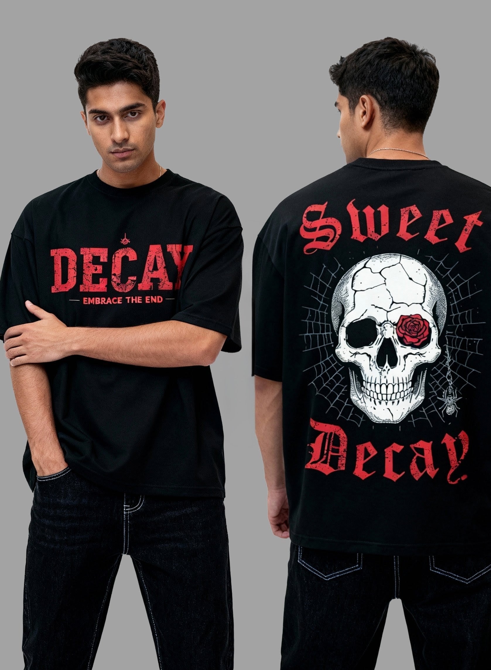 Embrace the beauty of decay with the Sweet Decay Tee. Featuring a cracked skull adorned with a single red rose and spider webs, this design symbolizes the inevitable yet beautiful cycle of life and death. The phrase “Sweet Decay” reminds us that in decay, there is a strange sweetness, an acceptance of what is and what will be. Wear this tee to show that you embrace life's fleeting nature and the elegance within it.