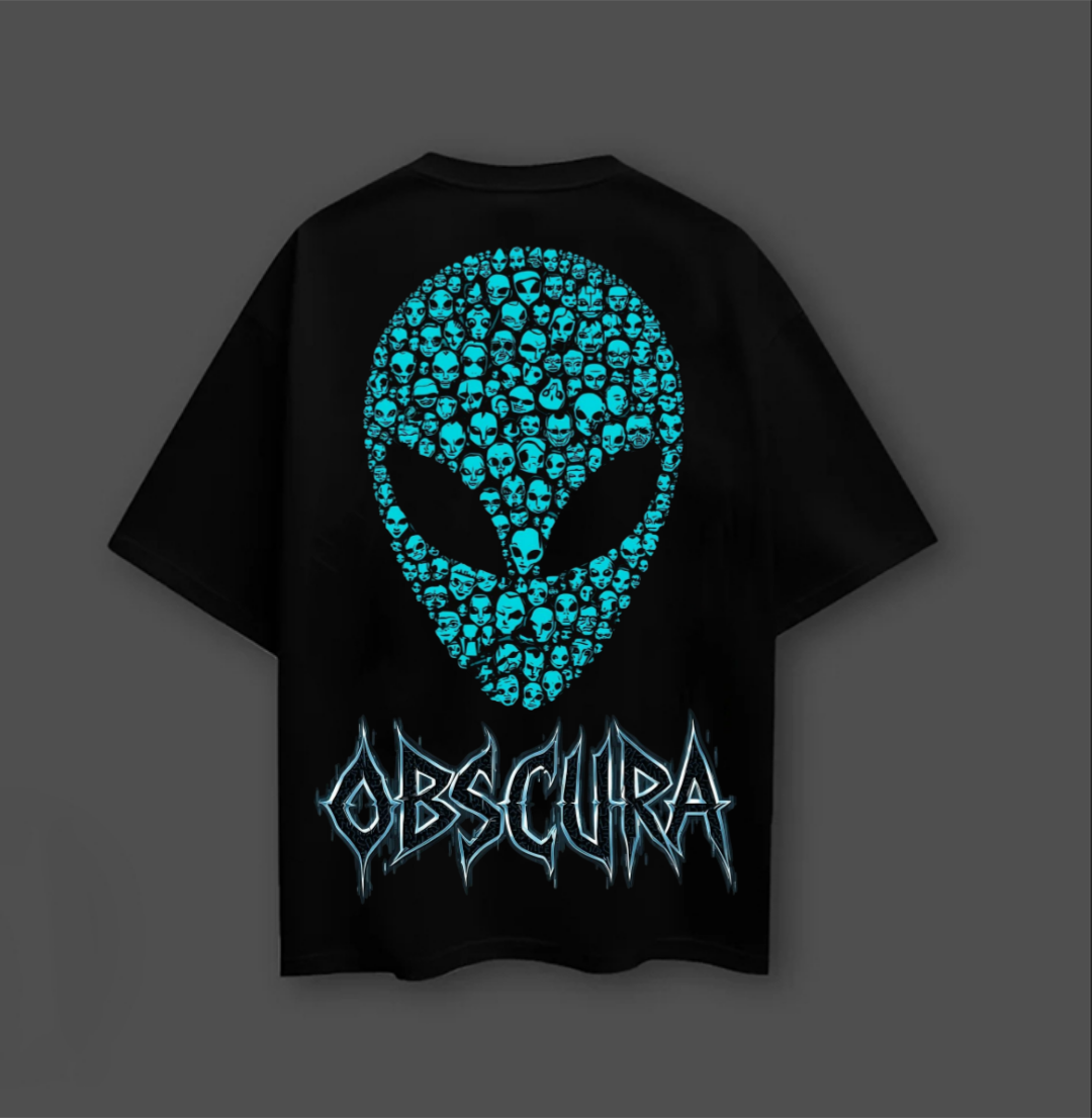Back: An alien skull mosaic crowned in shadows, with OBSCURA clawed across the void — where the unknown bleeds into legend.