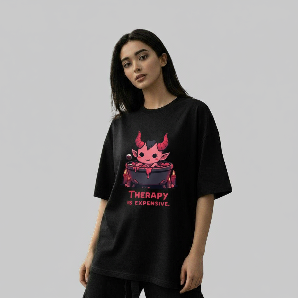 Embrace your inner devilish charm with the Therapy Is Expensive Tee. Featuring a cute yet mischievous demon relaxing in a bath of bubbles and candles, this shirt offers a darkly humorous twist on the everyday grind.